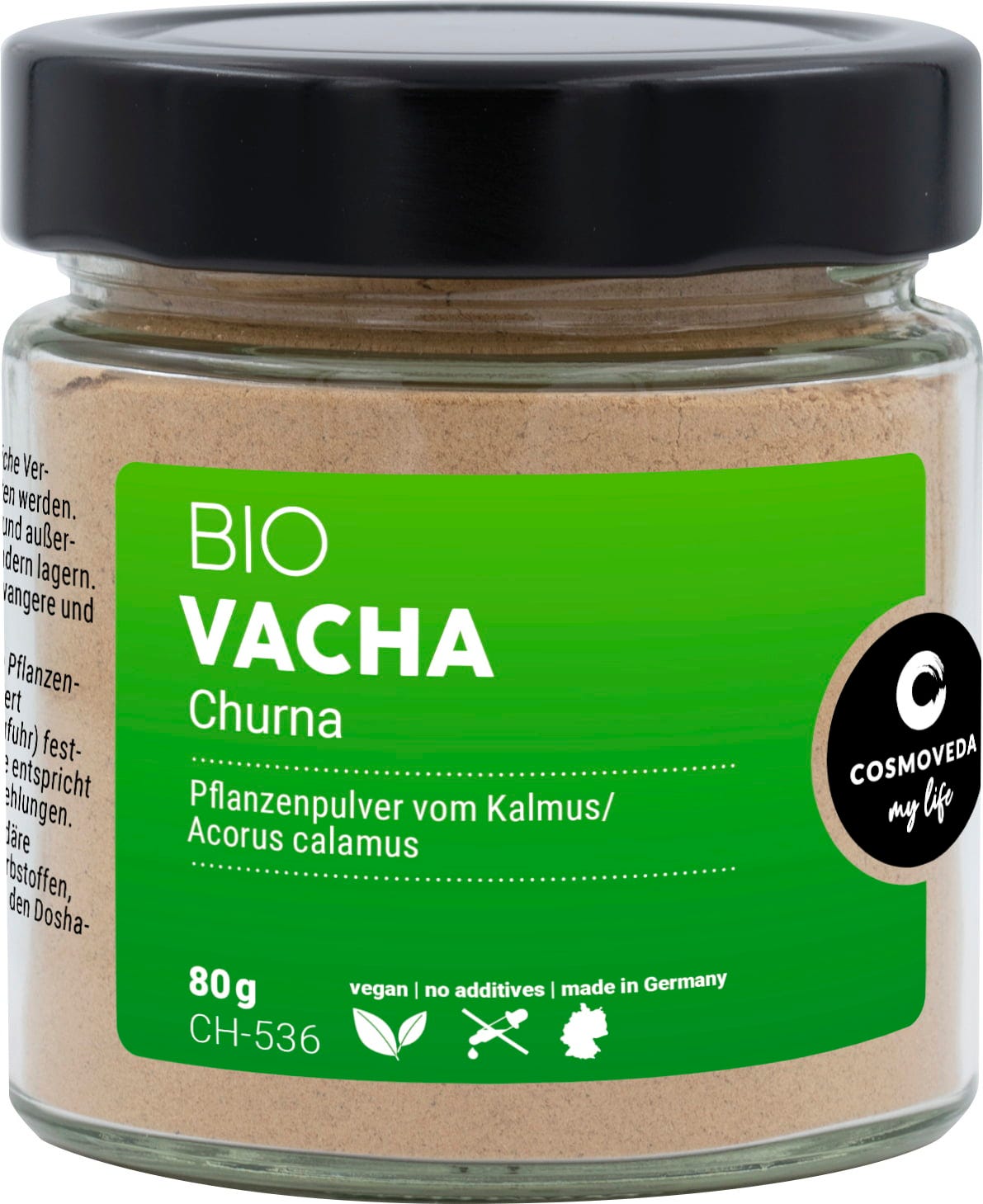 A Vacha - Acorus calamus - egy 60-100 cm magas, hüvelykujj vastagságú gyöktörzsű (rizóma) növény, amely háromszögletű szárat alkot, ülő kard alakú levelekkel és apró zöld virágokkal. Az ájurvédikus táplálkozásban a gyöktörzset használják fel.