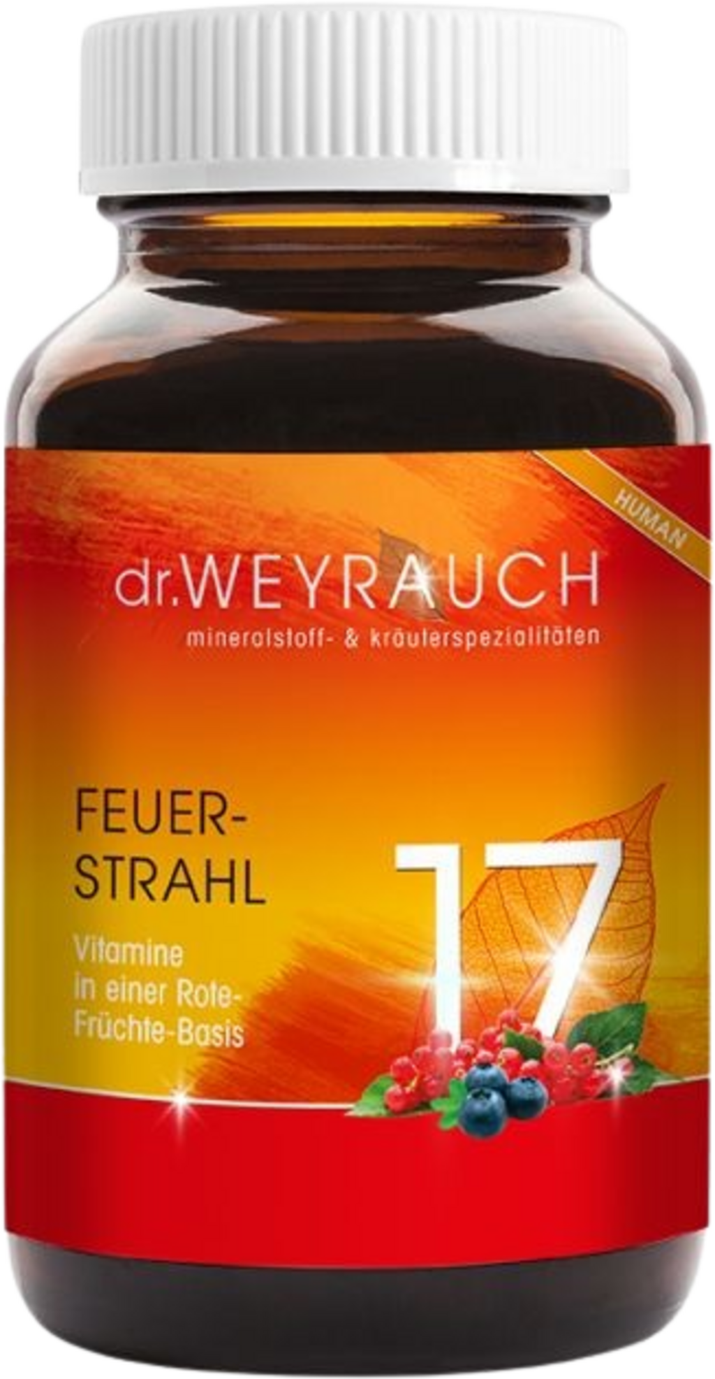 A dr. Weyrauch Nr. 17 Tűzsugár az összes vízben és zsírban oldódó vitamint ötvözi egy speciális, gyümölcsökből és kivonatokból álló bázisban. Ez az alap olyan piros gyümölcsökből áll, mint az áfonya, a fekete ribizli, a gránátalma és a goji bogyó. Ezáltal a termék olyan szekunder növényi anyagokat tartalmaz, mint az antocianinok, polifenolok és poliszacharidok. A receptúrát napraforgólecitin, glutamin aminosav, valamint paradicsomból származó lycopin egészíti ki.