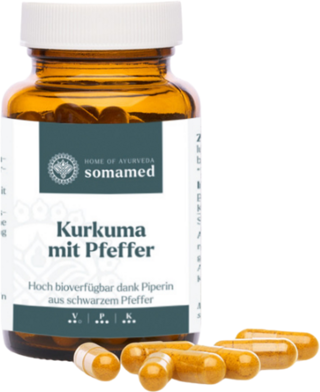 A kurkuma Dél-Ázsiából származik, és régóta meghonosodott az európai konyhában. A sárga gyökeret az étrendkiegészítő szegmensben is használják. A Home of Ayurveda somamed a legfinomabb kurkuma port és fekete borsot egyesíti gyógynövényes kapszuláiban. Egy kombináció, amelyet az Ayurveda használ a Vata, Pitta és Kapha doshák egyensúlyára.