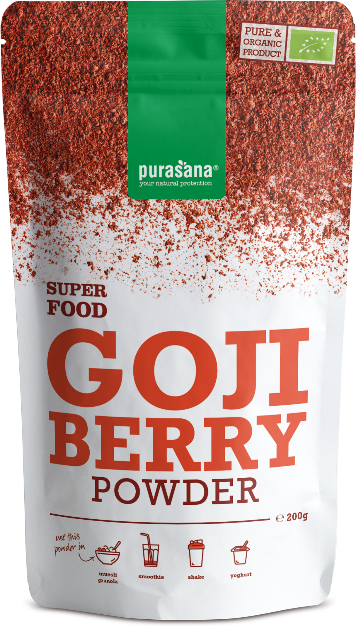 A goji egy narancssárgás pirosas, lédús bogyó Ázsiából, amely bokron terem. Purasana Goji bogyó por fagyasztva szárított por friss bogyókból.