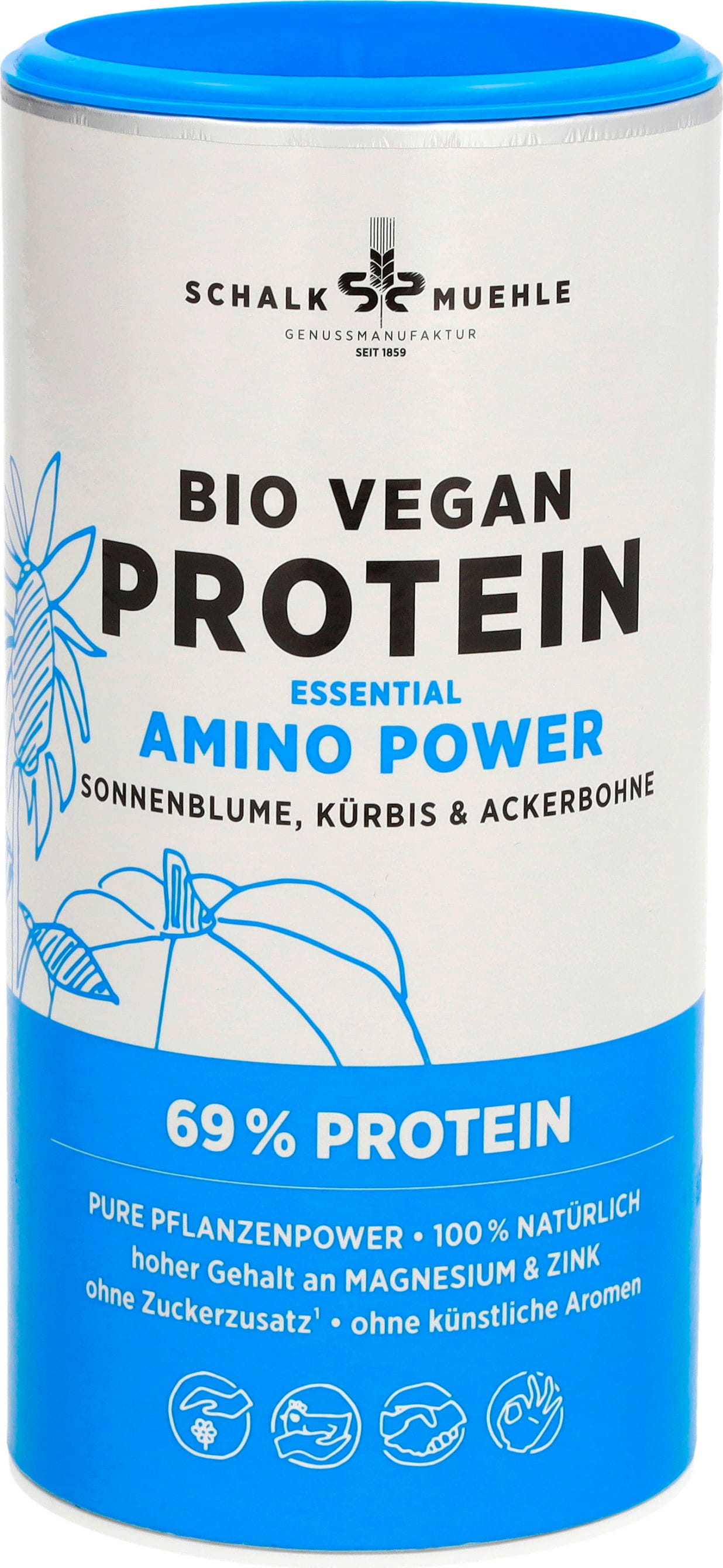 Ez a fehérjekeverék minden fontos összetevőt tartalmaz – a Schalk Mühle Bio Vegan Essential Amino Power fehérjepor nemcsak bőséges fehérjét, hanem minden esszenciális aminosavat, valamint magas magnézium- és cinktartalmat is biztosít. A kiváló minőségű keverék napraforgómagból, lóbabból és tökmagból áll. A receptúra 100% növényi alapú és hozzáadott cukortól mentes. Így tökéletesen beilleszthető a vegán és változatos életmódba.