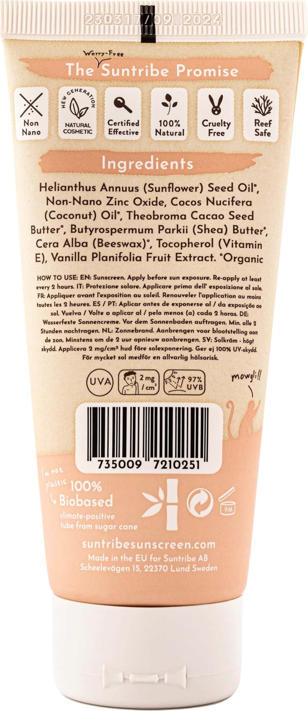 Ez a napkrém természetes összetételének köszönhetően védi a testet és a környezetet. Kiváló minőségű összetevők, mint például a szerves shea vaj vagy a bio napraforgóolaj, nedvességet és tápanyagokat biztosítanak a bőr számára, míg a nanomentes cink-oxid megvédi a bőrt a napsugárzás okozta károktól. A kellemes vaníliaillat kényezteti az érzékeket. Tökéletes a gondtalan játékhoz.