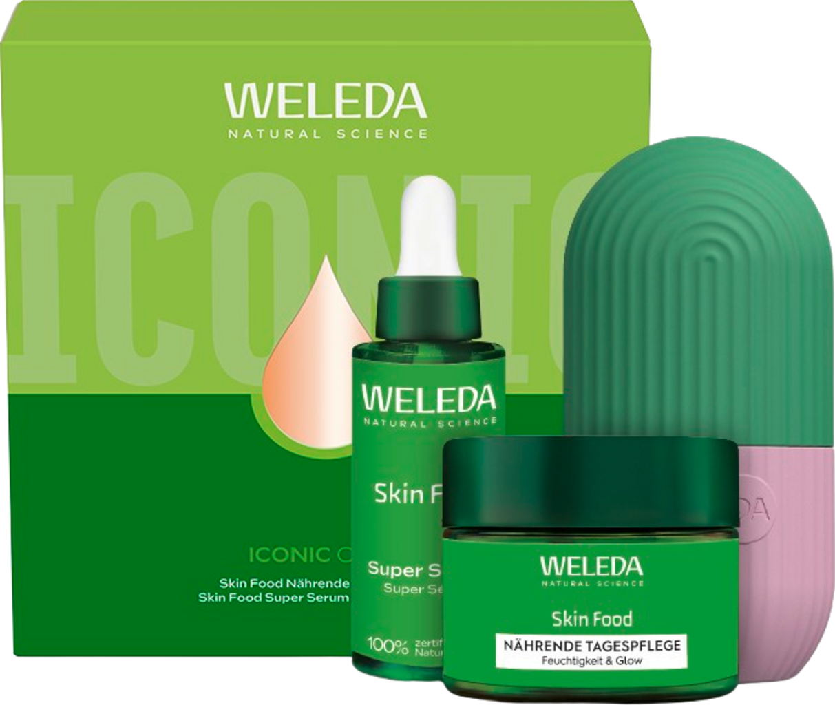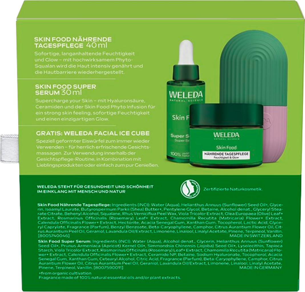 A ICONIC CARE ajándékcsomag ajándékkészlet két rendkívül hatékony bőrápoló terméket és egy újrafelhasználható hűsítő stiftet tartalmaz. A Skin Food termékcsaládból származó szérum és arckrém minden bőrtípusra alkalmas, és intenzíven tápláló és hidratáló tulajdonságokkal rendelkezik.